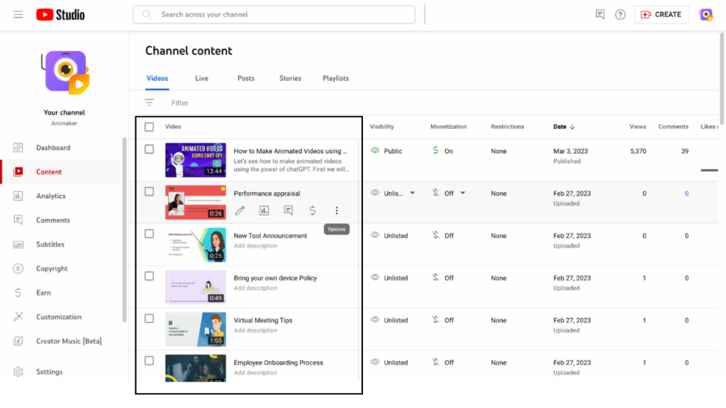 Paso 3. En la sección Contenido del canal, elija el vídeo que desea subtitular.